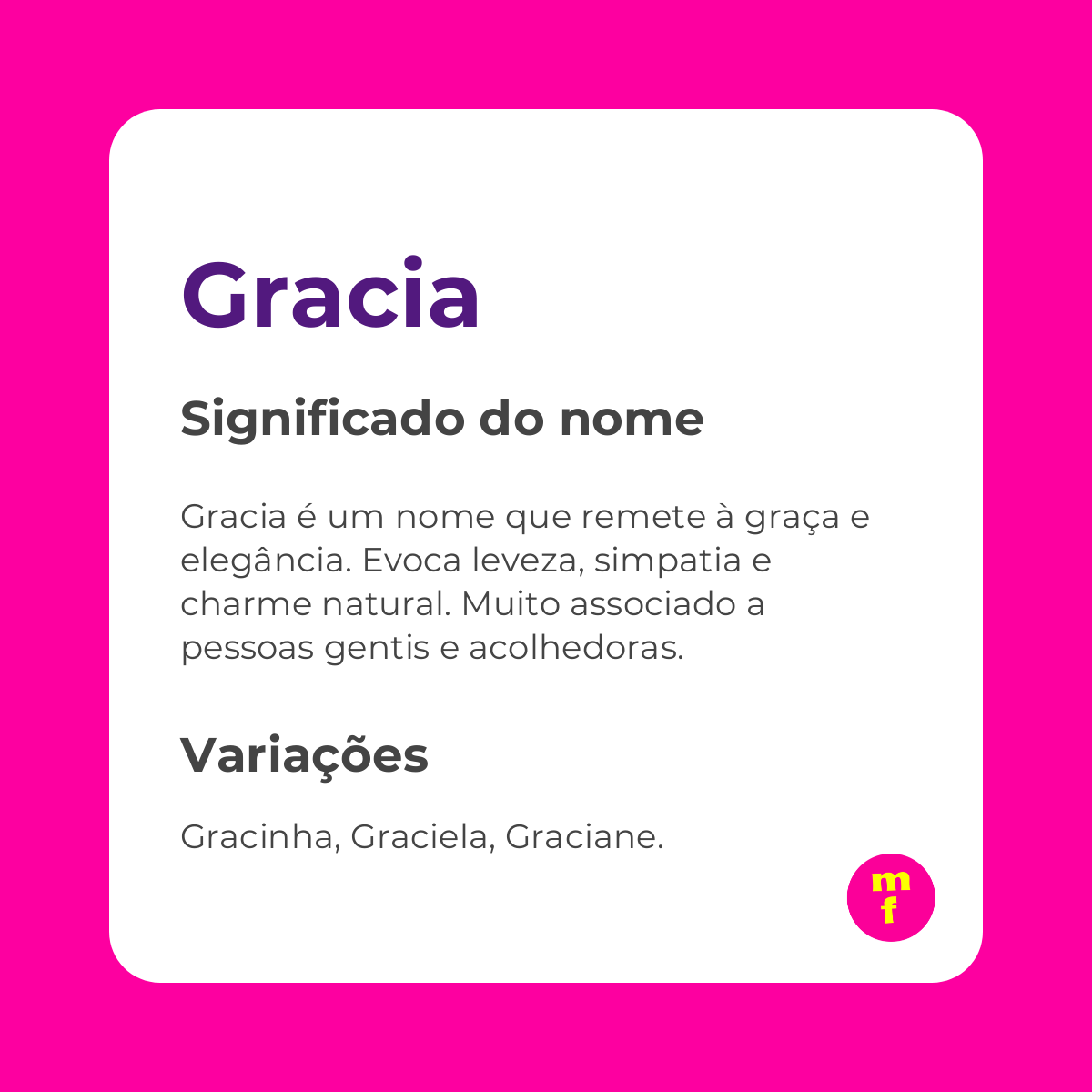 Gracia apresenta algumas variações em diferentes idiomas e culturas. Entre as mais próximas, estão Grace (inglês), Grazia (italiano), Grâce (francês) e Graciela (espanhol). No Brasil, Gracielle e Gracilene são versões derivadas que mantêm a essência do significado original. Cada variação traz um toque regional sem perder o charme ou a força da raiz latina.