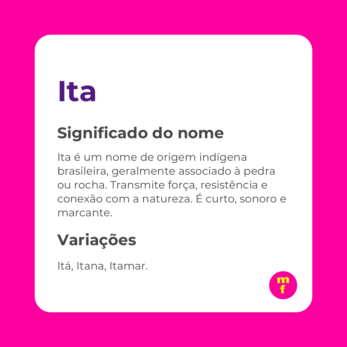 Em muitas culturas, nomes relacionados à natureza são vistos como protetores, conectando a pessoa com energias primordiais. Na tradição Tupi, pedras são símbolos de poder e ligação ancestral – uma energia que pode ser transferida, simbolicamente, a quem leva Ita como nome.