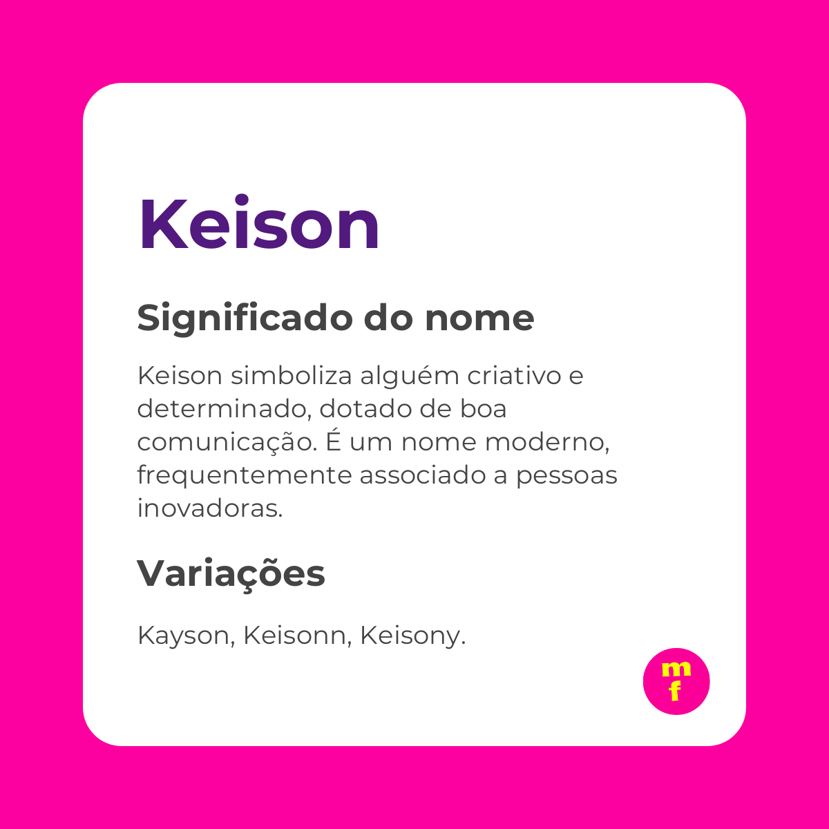 Por ser raro nos registros civis e possuir uma grafia inovadora, Keison oferece exclusividade e uma imagem contemporânea e diferenciada.