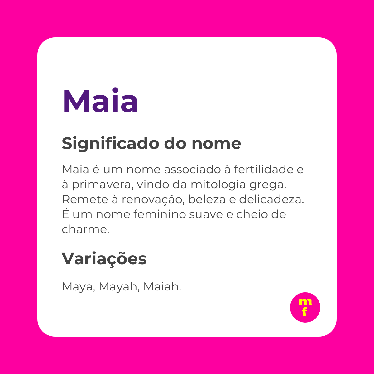 Ao pensar em nomes compostos, prefira opções suaves e que equilibrem o som do “Maia”. Exemplos: Sofia Maia, Maia Elena, Luiza Maia. A sonoridade é um dos principais pontos de encanto nesse nome.